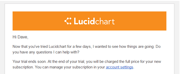 The most likely recommendation from the government will be that users must be notified a few days before their trial ends and told what will happen next. This could be as simple as an email to the users, such as this one from Lucidchart. The key is to make sure you keep selling the benefits to the customer here. This is their opportunity to cancel, so make your offering as compelling as possible.