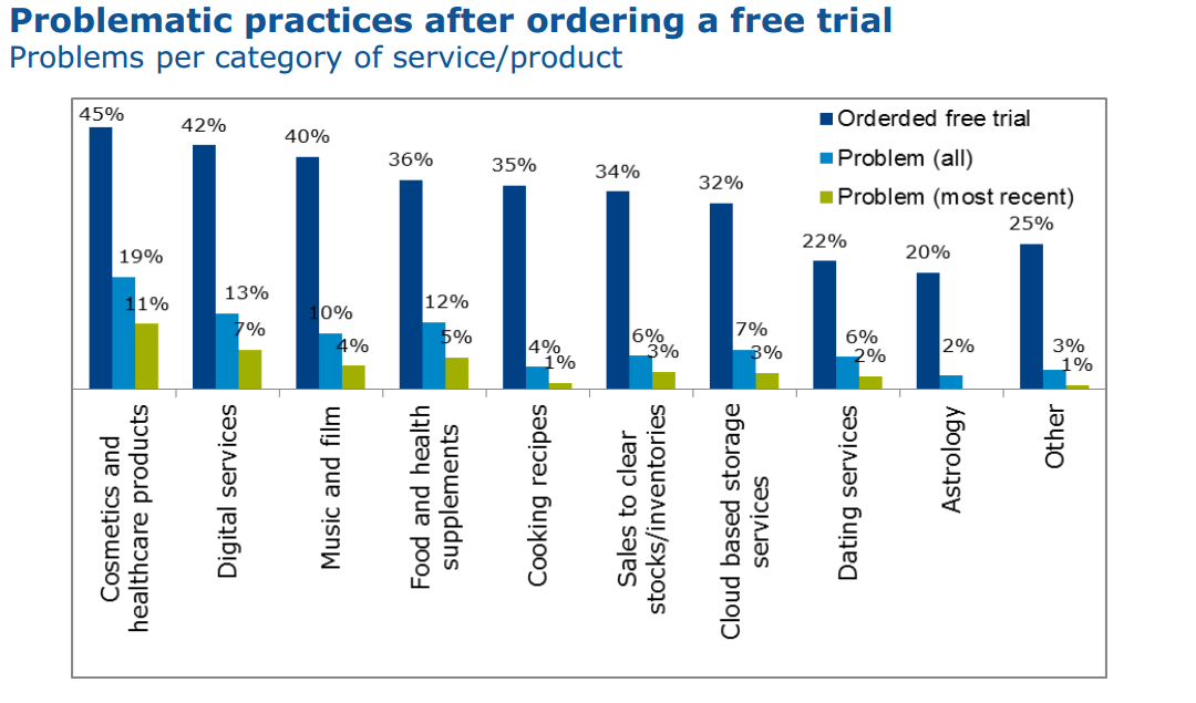 Over 21% of people in the EU who have tried a free trial have reported having a problem with it, the majority in the cosmetics and healthcare industry according to a study on subscription traps.